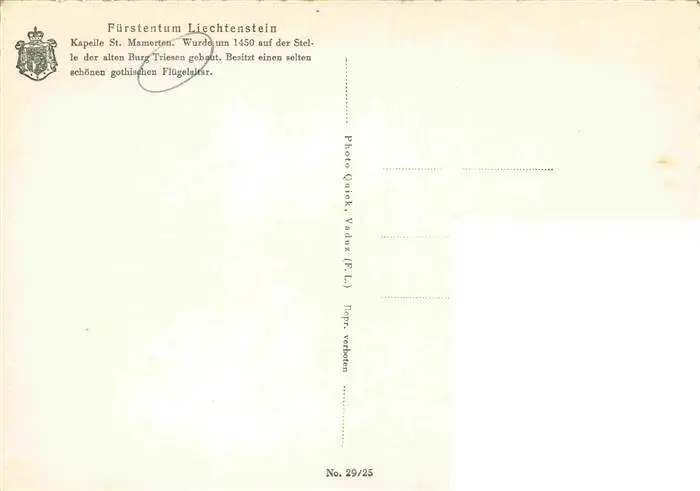 73979779 Liechtenstein_Fuerstentum Kapelle St Mamerten auf Stelle der alten Burg Triesen erbaut postalisch nicht gelaufen 1921-1965 Erhaltung siehe scans [WerneD78] [WernPID7 ]