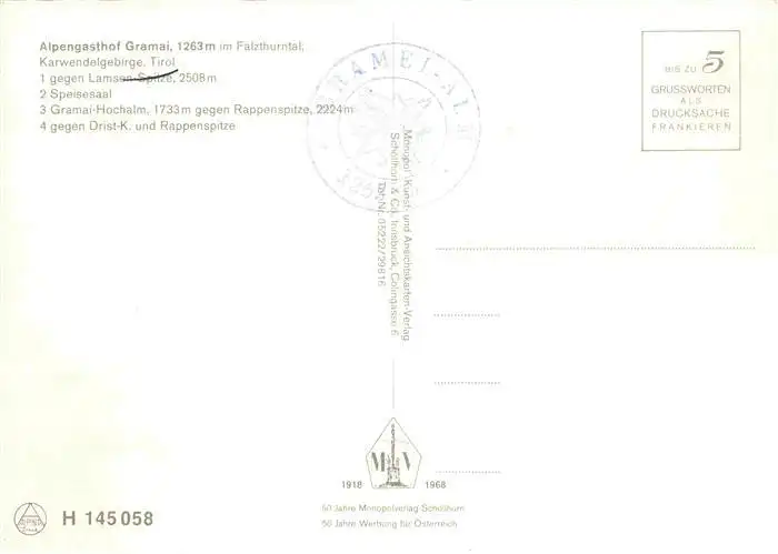 73984749 Gramaialm_1263m_Falzthurntal_Tirol_AT Alpengasthof Gramai mit Lamsen Spitze Speisesaal Rappenspitze Drist K und Rappenspitze postalisch nicht gelaufen nach 1965 Erhaltung siehe scans [WerneD78] [WernPID7 ]