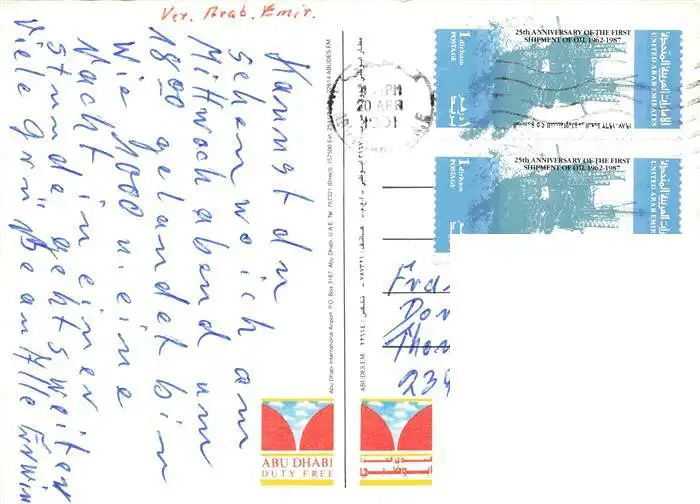 73984976 Abu_Dhabi_Emirates Duty Free postalisch gelaufen 1991 Erhaltung siehe scans [WerneD78] [WernPID7 ]