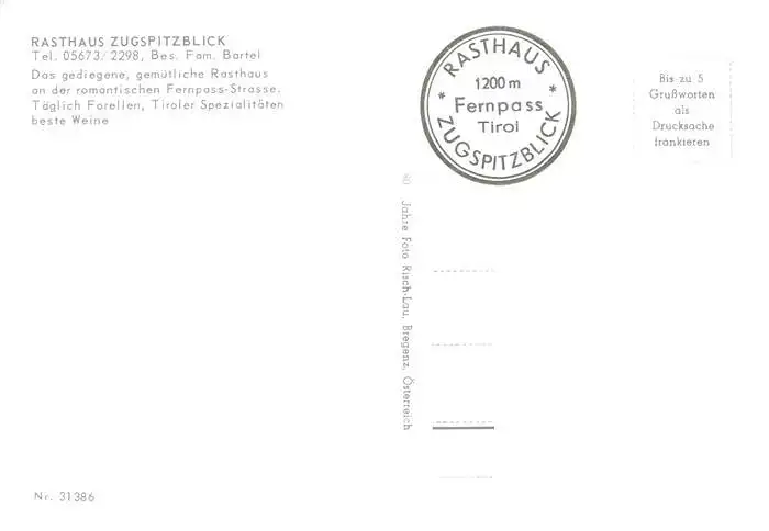 73990034 Fernpass_Reutte_Tirol_AT Rasthaus Zugspitzblick postalisch nicht gelaufen nach 1965 Erhaltung siehe scans [WerneD78] [WernPID7 ]