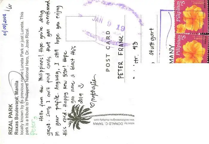74001154 Manila__Philippines Rizal Park Monument Dr. Jose Rizal Philippine National Hero postalisch gelaufen 2019 Erhaltung siehe scans [FriedD77] [Frierer ]