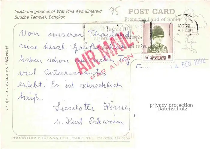 74004380 Bangkok_Thailand Wat Phra Keo Emerald Buddha Temple postalisch gelaufen 1992 Erhaltung siehe scans [FriedD77] [Frierer ]
