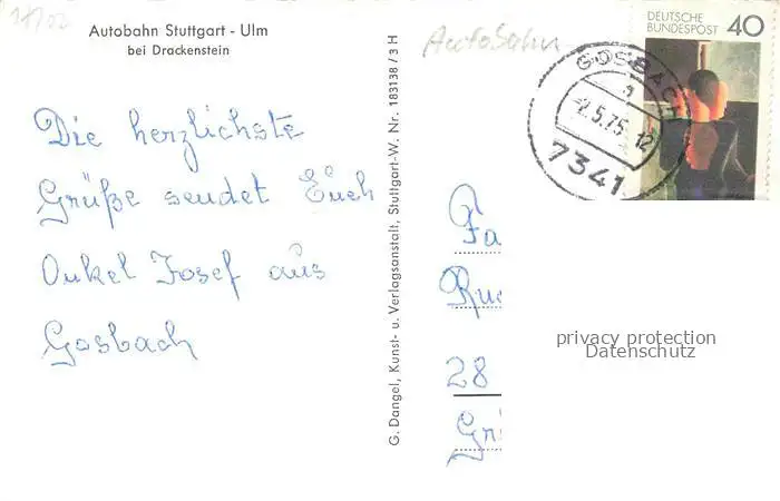 alte Postkarte 74007663 Autobahn Autostrada Autoroute Highway Stuttgart Ulm Drackenstein postalisch gelaufen Erhaltung siehe scans [IrynaD87] [Iryn PID ]