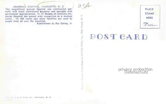 74011890 Charlotte North Carolina USA Memorial Hospital postalisch nicht gelaufen Erhaltung siehe scans [FriedD77]