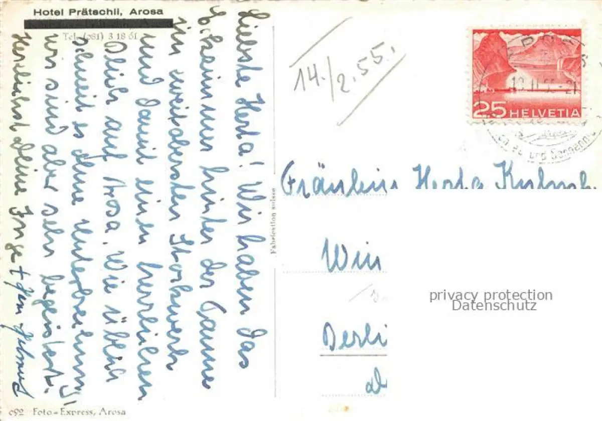 14109352 AROSA GR Hotel Praetschli postalisch gelaufen Erhaltung siehe scans [WerneD78] alte Postkarte Wern Katcode 11470100345296