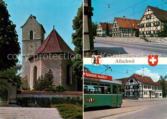 AK / Ansichtskarte Allschwil Kirche Fachwerkhaeuser Strassenbahn Allschwil