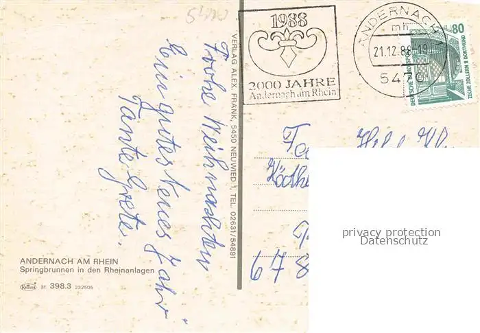 alte Postkarte Andernach Rhein Rheinanlagen Springbrunnen postalisch gelaufen Erhaltung siehe scans [WerneD78]