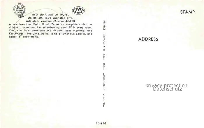 Arlington Virginia USA Iwo Jima Motor Hotel Fliegeraufnahme postalisch nicht gelaufen Erhaltung siehe scans [WerneD78]