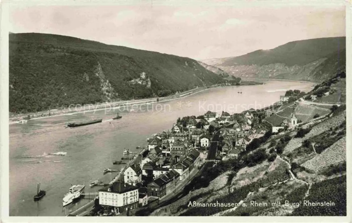 alte Postkarte AssMANNSHAUSEN Rhein Panorama Blick ueber den Rhein mit Burg Rheinstein postalisch gelaufen Erhaltung siehe scans [FriedD77]