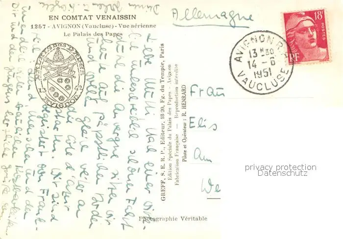 Avignon_Vaucluse Vue aerienne Le Palais des Papes Avignon Vaucluse postalisch gelaufen 1951 Erhaltung siehe scans [FriedD77] Frierer
