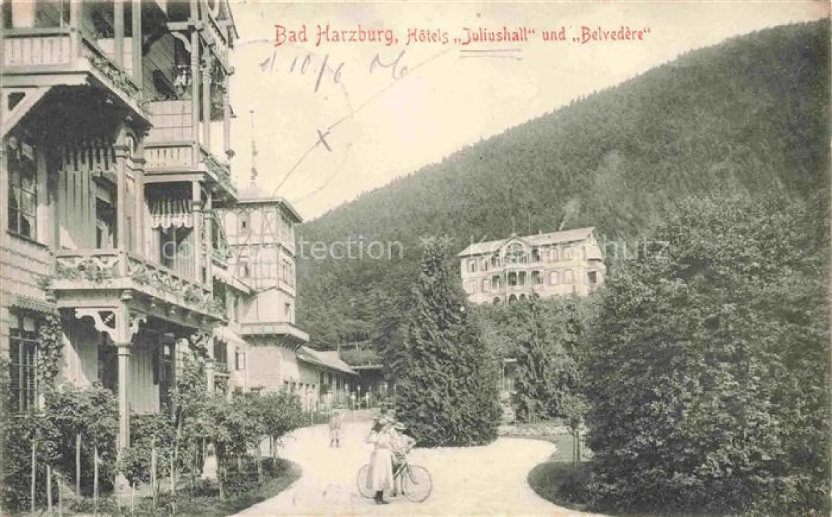 alte Postkarte BAD HARZBURG Niedersachsen Hotels Juliushall und Belvedere postalisch gelaufen Erhaltung siehe scans [FriedD77]