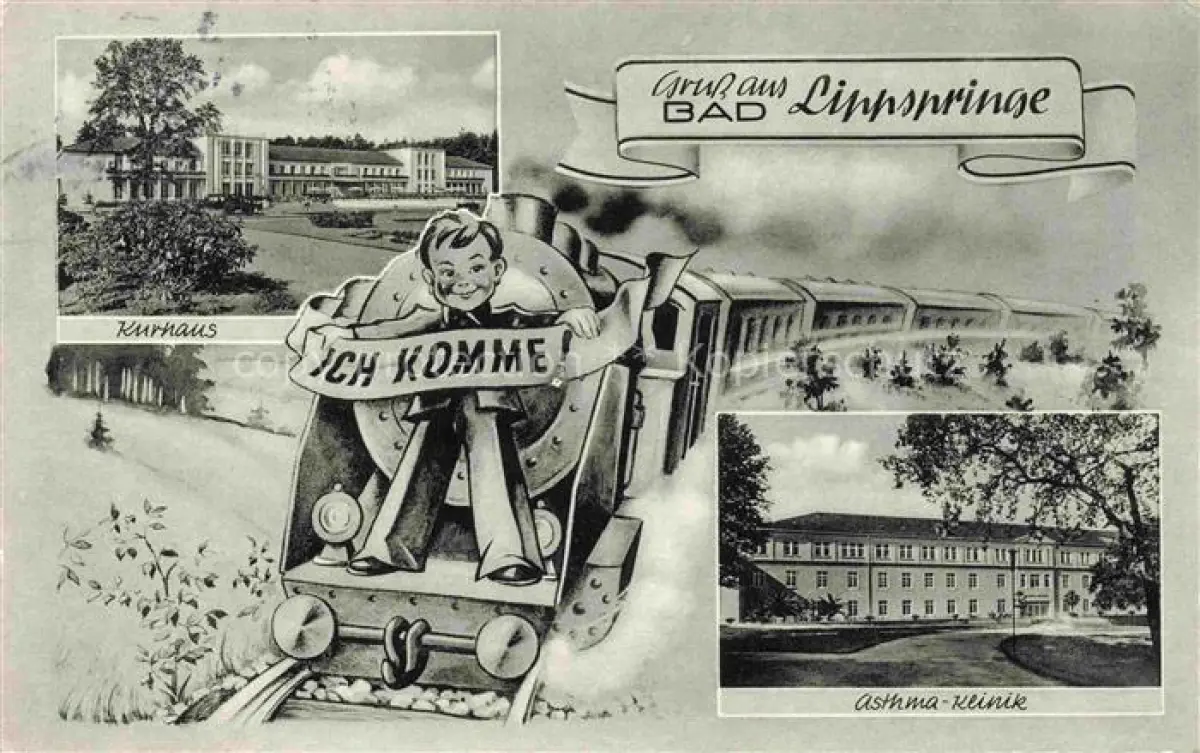 alte Postkarte BAD LIPPSPRINGE Kurhaus Asthma-Klinik Dampflokomotive Karikatur postalisch gelaufen Erhaltung siehe scans [FriedD77]