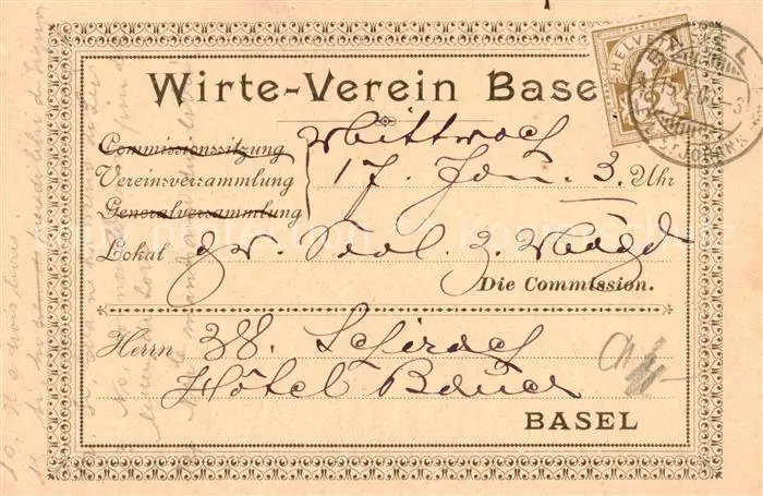 Basel_BS Generalversammlung des Wirte Vereins Basel Basel_BS postalisch nicht gelaufen 1910 Erhaltung siehe scans [WerneD78] WernPID7