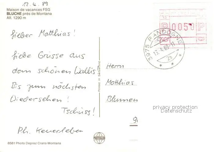Bluche_Randogne Maison de vacances FSG Bluche Randogne postalisch gelaufen 1989 Erhaltung siehe scans [FriedD77] Frierer