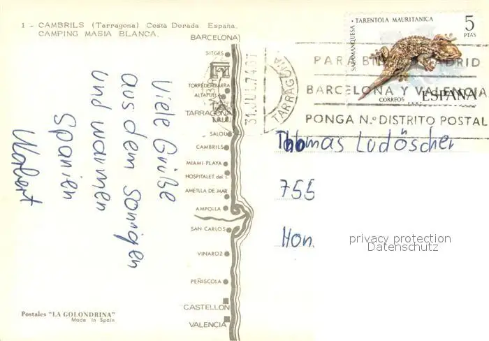 Cambrils_Costa_Dorada Camping Masia Blanca postalisch gelaufen 1974 Erhaltung siehe scans [FriedD77] Frierer