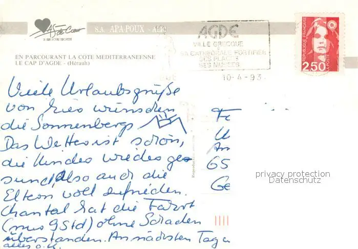 Cap-d_Agde en parcourant la Côte Méditerranéene vue aérienne Cap-d_Agde postalisch gelaufen 1993 Erhaltung siehe scans [FriedD77] Frierer
