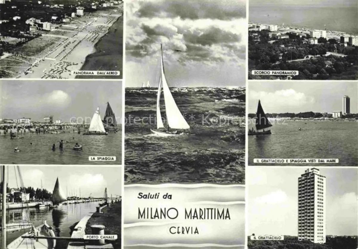 Cervia MILANO MARITTIMA Emilia-Romagna IT Fliegeraufnahme La Spiaggia Porto Canale Scorcio Panoramico Grattacielo e spiaggia vesti dal mare Grattacielo postalisch nicht gelaufen Erhaltung siehe scans [WerneD78] Wern Katcode 11240