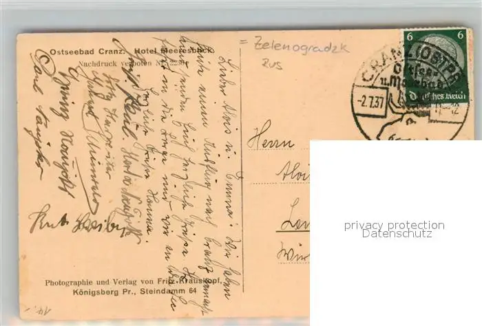 Cranz_Ostseebad Hotel Meeresblick Cranz_Ostseebad postalisch gelaufen 1937 Erhaltung siehe scans [KathaD81] Kathoren