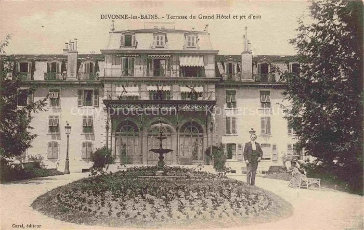 alte Postkarte Divonne-les-Bains GEX 01 Ain Terrasse du Grand Hôtel et jet d'eau Fontaine postalisch gelaufen Erhaltung siehe scans [FriedD77]