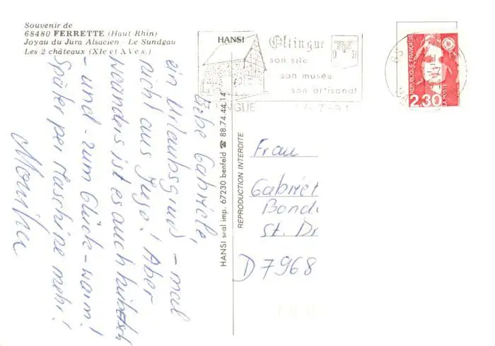 Ferrette_Haut-Rhin Vue aérienne Ferrette Haut-Rhin postalisch gelaufen 1991 Erhaltung siehe scans [FriedD77] Frierer