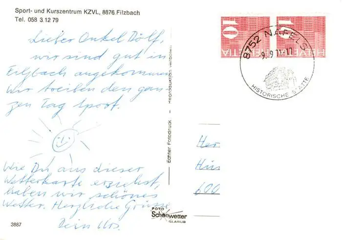 Filzbach_GL Sport- und Kurszentrum KZVL Kaminzimmer Tennisplaetze Alpenblick postalisch gelaufen 1971 Erhaltung siehe scans [FriedD77] Frierer