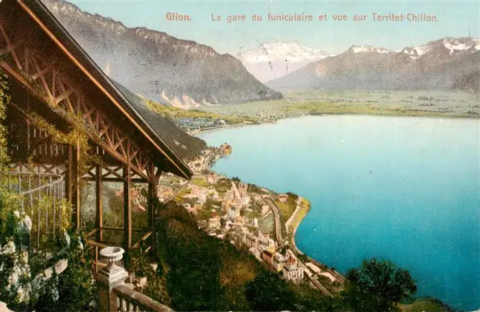 Glion__VD La gare du funiculaire et vue sur Territet Chillon postalisch gelaufen 1917 Erhaltung siehe scans [WerneD78] WernPID7