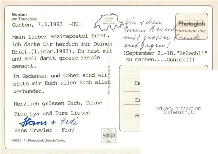 Gunten_Thunersee Fliegeraufnahme Gunten Thunersee postalisch gelaufen 1993 Erhaltung siehe scans [FriedD77] Frierer