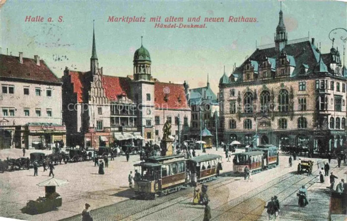 alte Postkarte HALLE SAALE Marktplatz Rathaeuser Haendeldenkmal Feldpost postalisch gelaufen Erhaltung siehe scans [FriedD77]