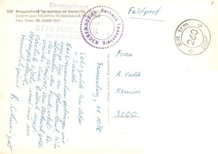 Haslen_GL Berggasthaus Tannenberg Fernsicht Feldpost Haslen_GL postalisch gelaufen 1976 Erhaltung siehe scans [FriedD77] Frierer