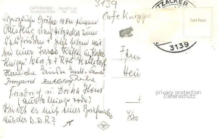 Hitzacker_Elbe Cafe Knigge Hitzacker Elbe postalisch gelaufen 1921-1965 Erhaltung siehe scans [WerneD78] WernPID7