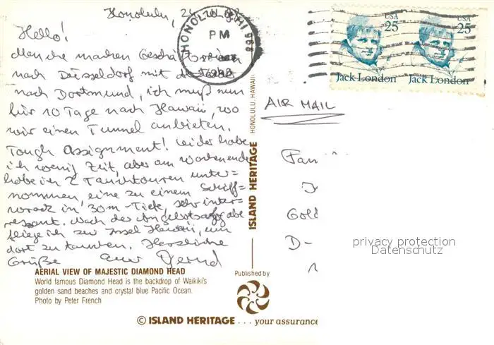 Honolulu Aerial view of majestic Diamon Head Pacific Ocean postalisch gelaufen 1988 Erhaltung siehe scans [FriedD77] Frierer