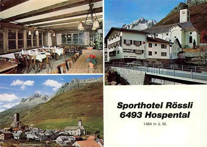 AK / Ansichtskarte Hospental Hospenthal UR Sporthotel Roessli Gastraum Panorama Kirche
