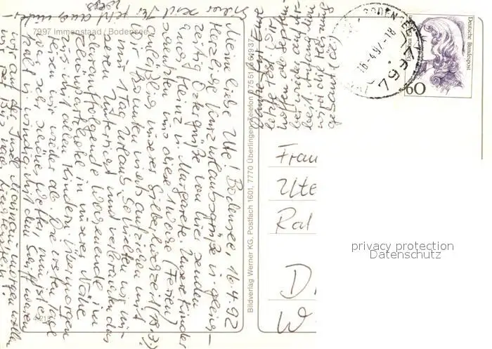 Immenstaad_Bodensee Ansicht mit Kirche vom See aus Immenstaad_Bodensee postalisch gelaufen 1992 Erhaltung siehe scans [FriedD77] Frierer
