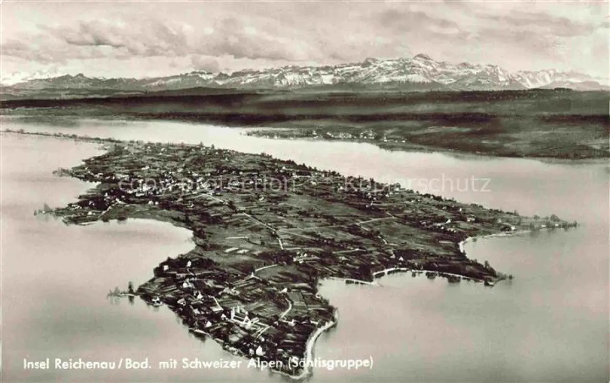 74121923 Insel Reichenau mit Schweizer Alpen Saentisgruppe Appenzeller Alpen postalisch nicht gelaufen Fliegeraufnahme Erhaltung siehe scans [FriedD77] Fliegeraufnahme Frie Katcode 11110008335066