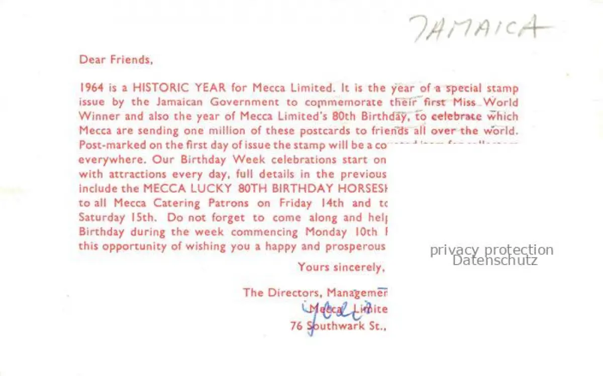 Jamaica Caribic Miss World 1963 postalisch nicht gelaufen Werbekarte (keine Postkarte) Erhaltung siehe scans [WerneD78]