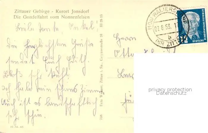 Jonsdorf Gondelfahrt vom Nonnenfelsen Jonsdorf postalisch gelaufen 1953 Erhaltung siehe scans [KathaD81] Kathoren
