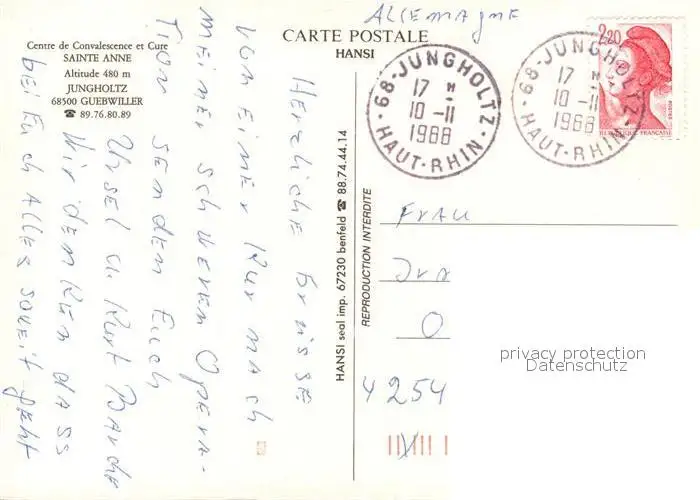 Jungholtz Centre de Convalescence et Cure Sainte Anne vue aérienne Jungholtz postalisch gelaufen 1968 Erhaltung siehe scans [FriedD77] Frierer