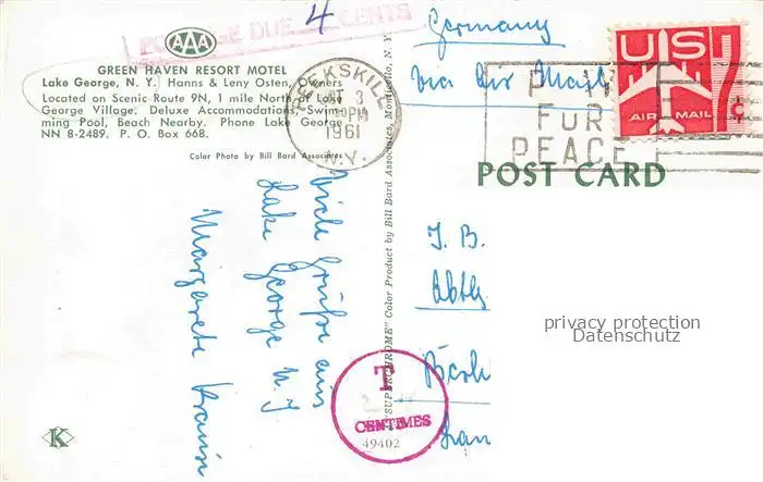 old postcard Lake George New York USA Green Haven Resort Motel Pool postalisch gelaufen Erhaltung siehe scans [WerneD78]
