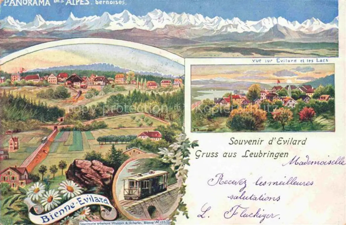 14087123 Leubringen Biel Bienne BE Panorama des Alpes Bernoises vue sur Evilard et les lacs vue générale Kuenstlerkarte postalisch gelaufen Erhaltung siehe scans [FriedD77] alte Postkarte Frie Katcode 11470060140958