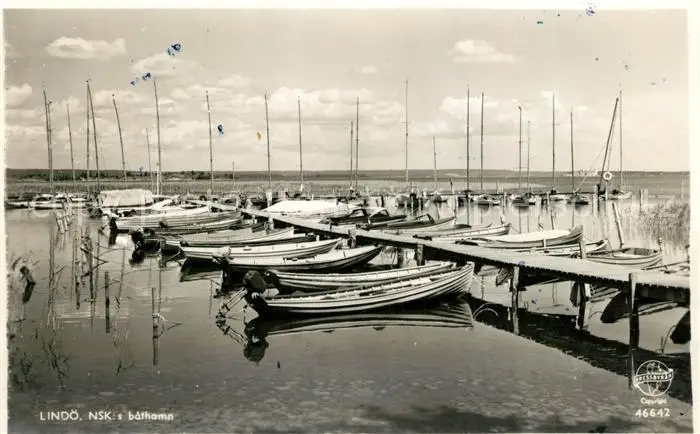 Lindoe Kategorie Alte Ansichtskarten Postkarten sa87882 Lindoe Bathamn Bootshafen postalisch gelaufen 1956 Erhaltung siehe scans [FriedD77]