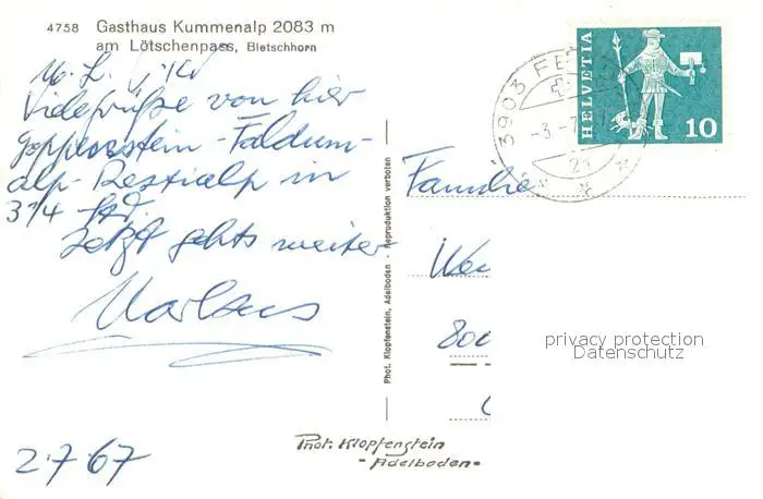 Loetschenpass Gasthaus Kummenalp mit Bietschhorn Loetschenpass postalisch gelaufen 1967 Erhaltung siehe scans [WerneD78] WernPID7