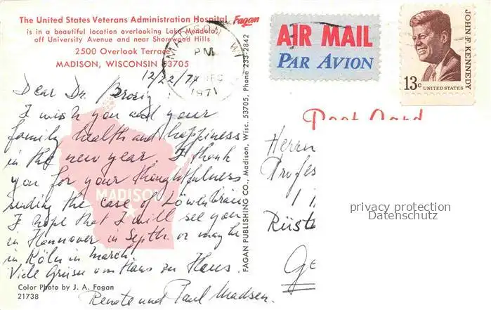 alte Postkarte Madison Wisconsin USA United States Veterans Administration Hospital postalisch gelaufen Erhaltung siehe scans [WerneD78]