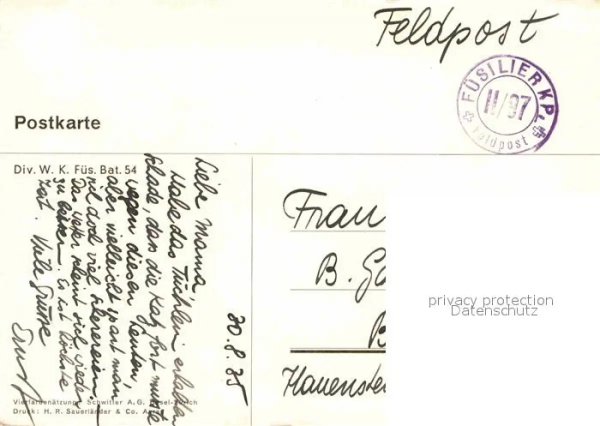 alte Postkarte Militaria Schweiz Divisions WK 1935 Fues. Bat. 54 postalisch gelaufen Feldpost - Stempel Erhaltung siehe scans [ChrisD19]