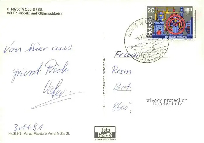 Mollis_GL mit Rautispitz und Glaernischkette postalisch gelaufen 1981 Erhaltung siehe scans [WerneD78] WernPID7