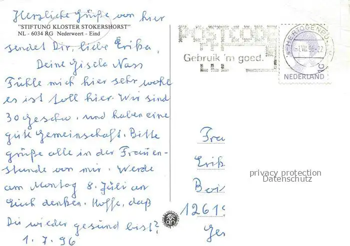 old postcard Nederweert-Eind NL Stiftung Kloster Stokershorst Festsaal Gastraum Park postalisch gelaufen Erhaltung siehe scans [WerneD78]