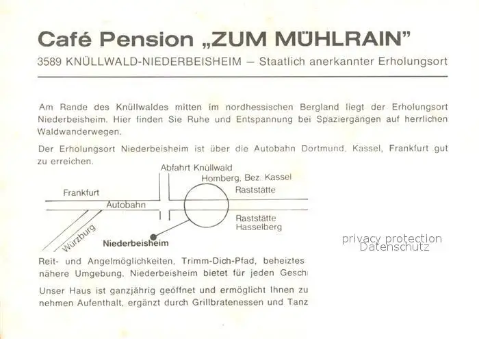 Niederbeisheim Pension Zum Muehlrain Gastraeume Terrasse Niederbeisheim postalisch nicht gelaufen nach 1965 Werbekarte (keine Postkarte) Erhaltung siehe scans [WerneD78] Werbekarte (keine Postkarte) WernPID7