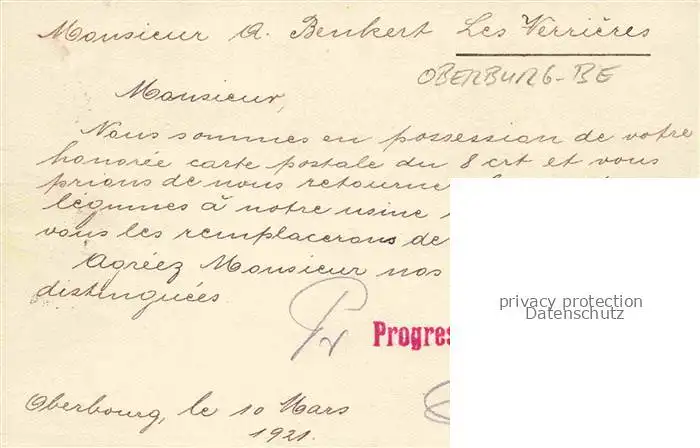 14059800 Oberburg BURGDORF BE Progressa S.A. Oberbourg Geschaeftskorrespondenz postalisch gelaufen Erhaltung siehe scans [FriedD77] alte Postkarte Frie Katcode 11470060150038