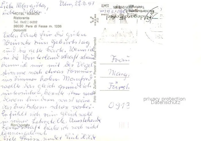 Pera_di_Fassa Hotel Ramon Ristorante Pera_di_Fassa postalisch gelaufen 1993 Erhaltung siehe scans [WerneD78] WernPID7