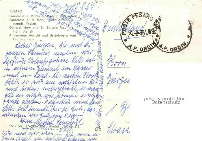 old postcard Pesaro Marche IT Fliegeraufnahme mit Bartoloberg postalisch gelaufen Erhaltung siehe scans [WerneD78]