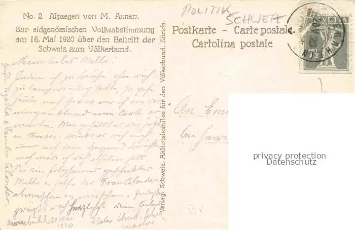Politik_Schweiz_BERN_BE Voelkerbund postalisch gelaufen 1920 Erhaltung siehe scans [IrynaD87] Iryn PID